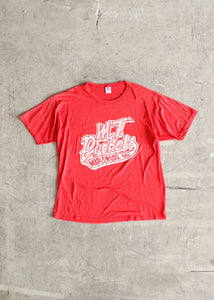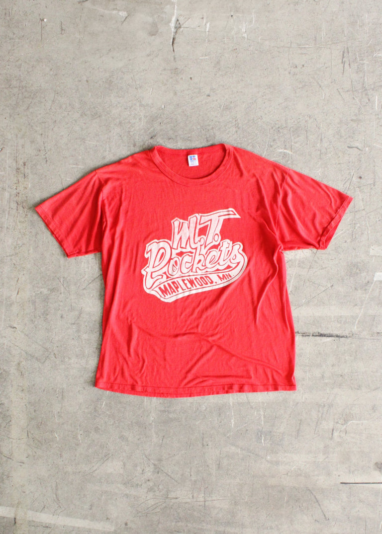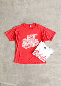 Authentic 1980s-1990s Made in USA distressed Rebels graphic tshirt paired with a 1980s-1990s Made in USA Russel branded Maplewood MT Rockets graphic tshirt.