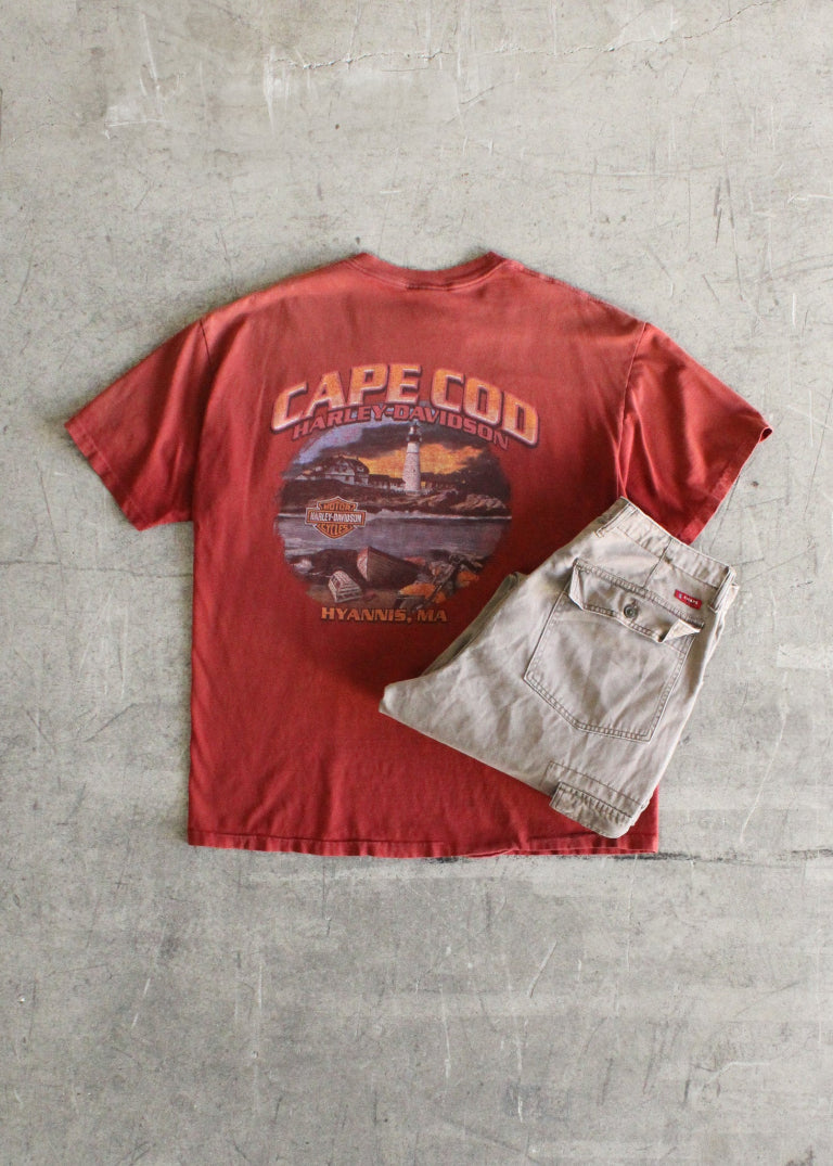 Authentic 1990s- Y2K Harley Davidson graphic tshirt paired with Chaps khaki cargo pants.
