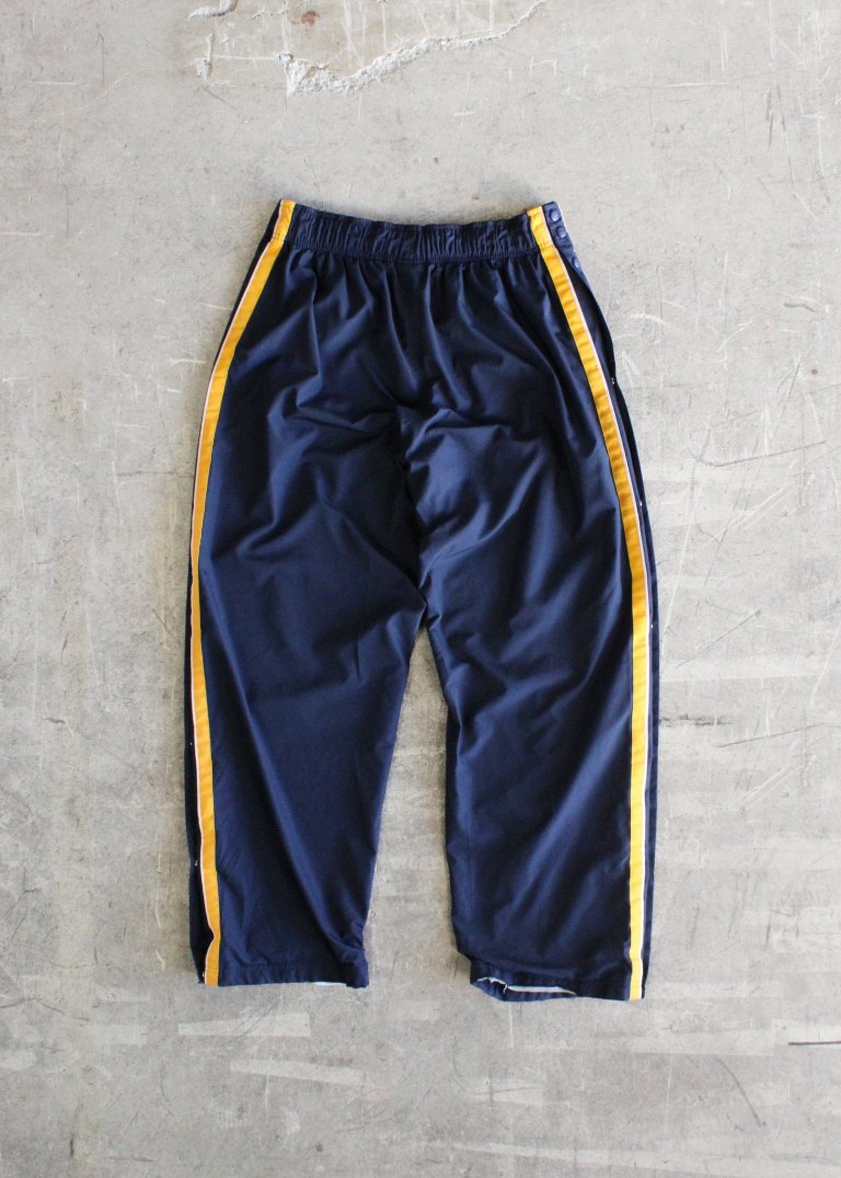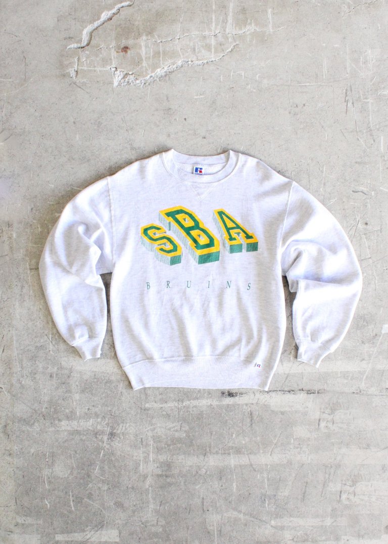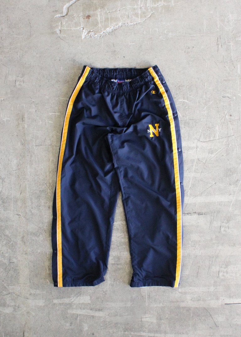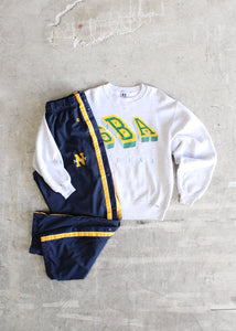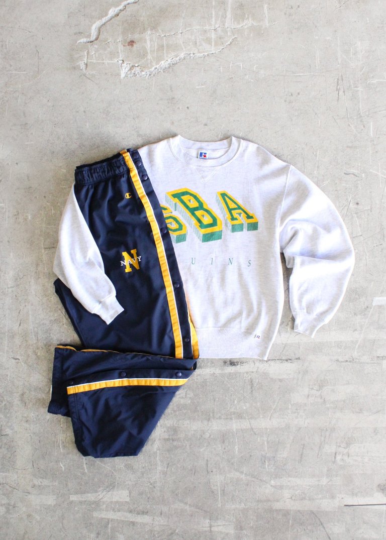 Authentic 1990s Russell Made in USA SBA Bruins sweatshirt paired with Champion brand Navy track pants with button down sides.