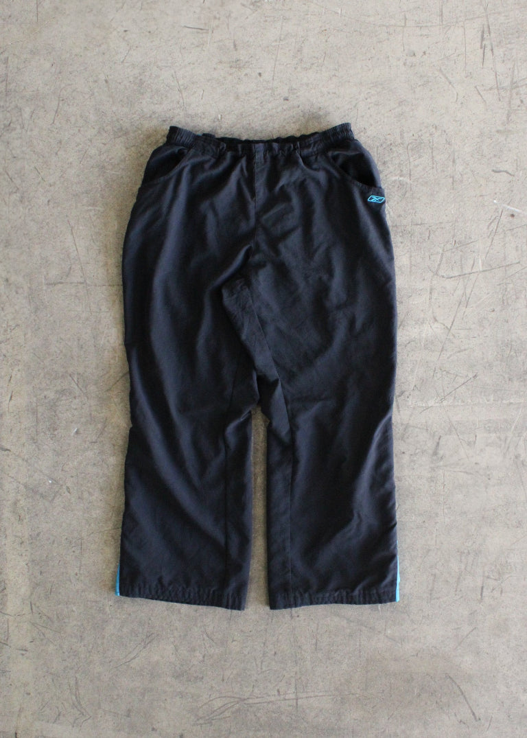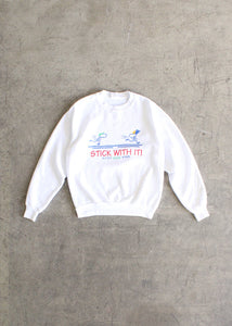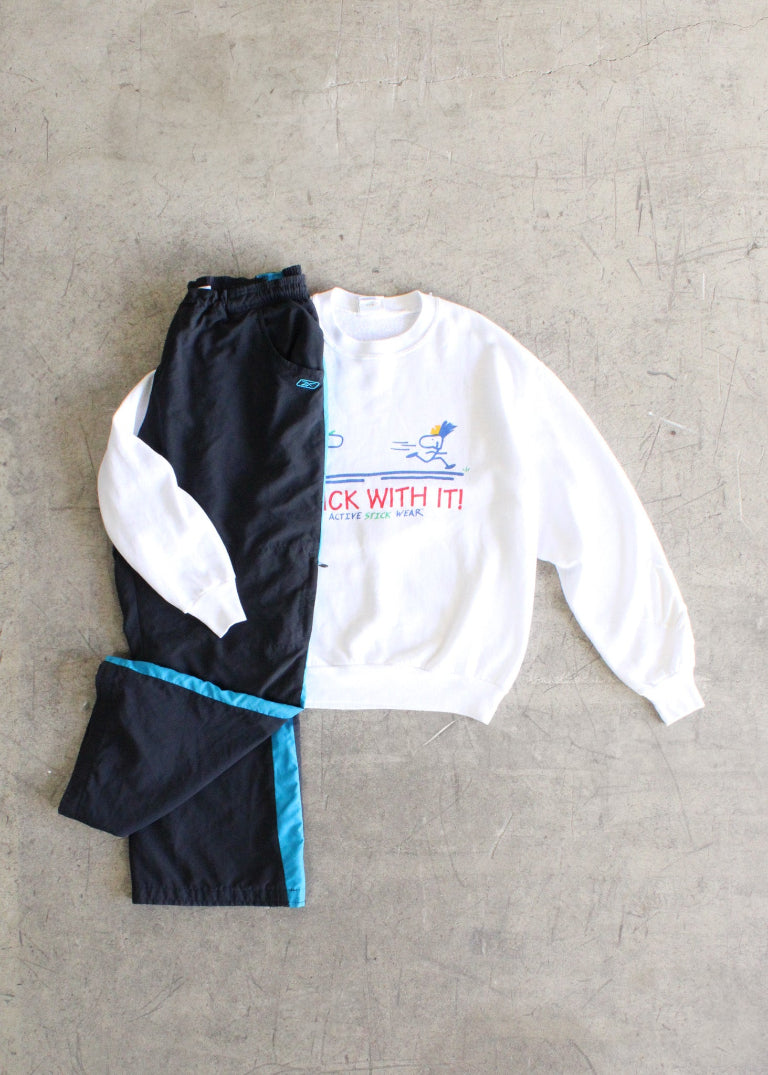 Authentic 1980s-1990s Stick With It crewneck pullover with patchwork paired with Reebok Track Pants.