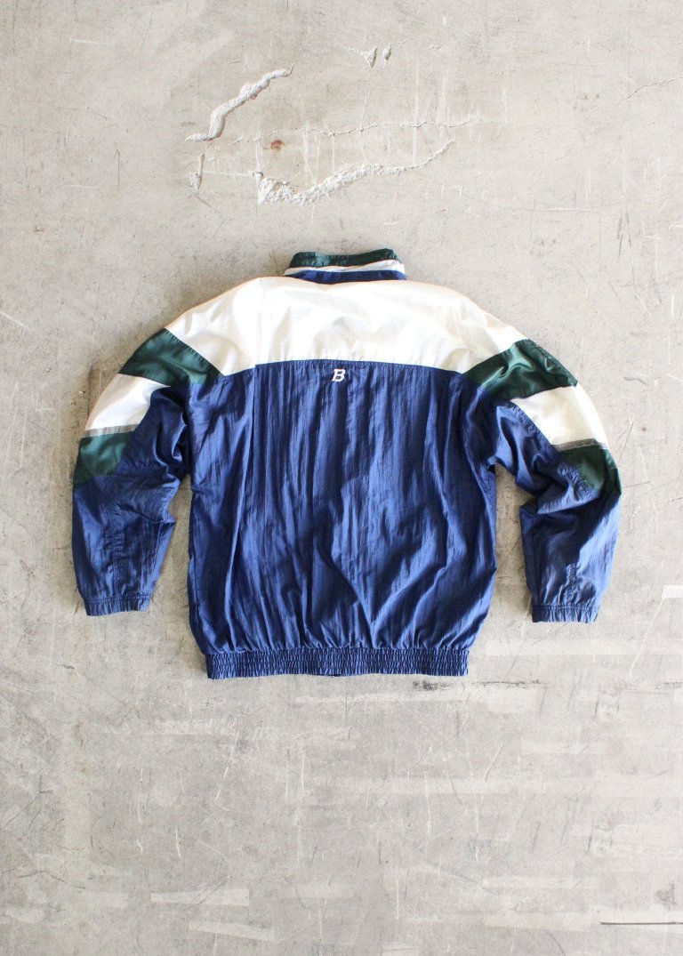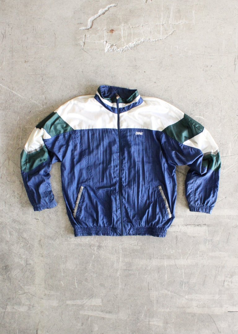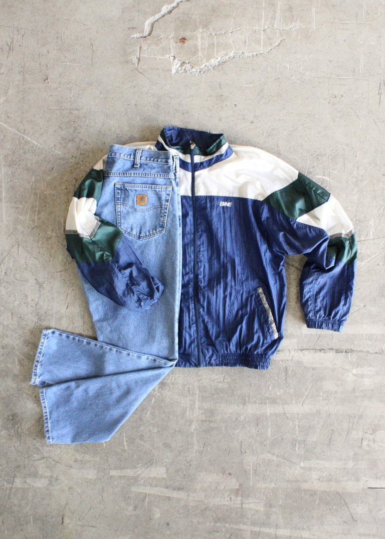 Authentic 1990s Bike sporty track jacket paired with Carhartt denim jeans.
