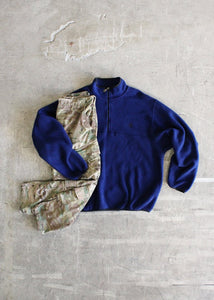 Authentic Champion fleece pull over with quarter zip collar paired with camo/ army cargo pants.