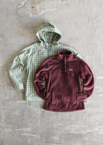 Authentic Patagonia fleece pullover with snap collar paired with a Y2K G.H. Bass & Co. plaid smock style pullover jacket.