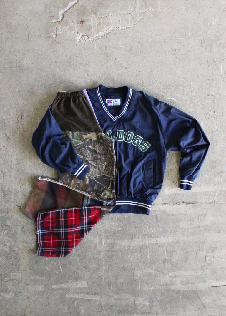 Authentic Russell Athletic Bulldogs wind shirt paired with RCYCLD Flannel Pieced Pants.