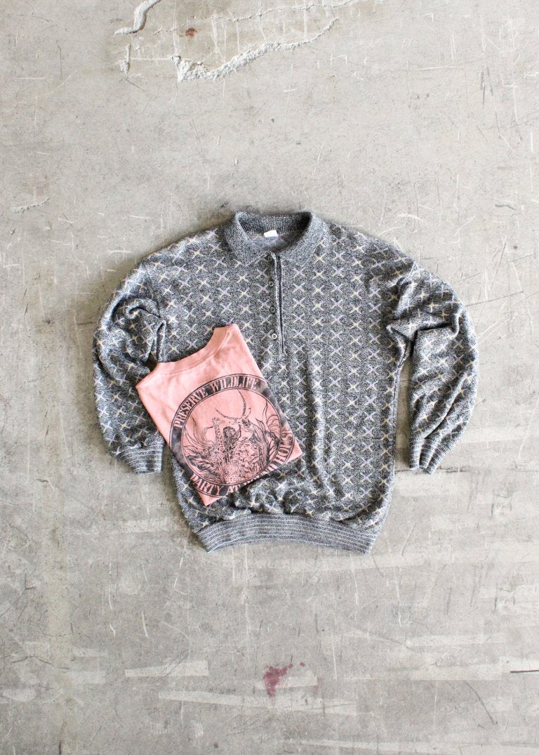 Authentic 1980s Wildlife Preservation graphic tee paired with a 1990s printed collared sweater.