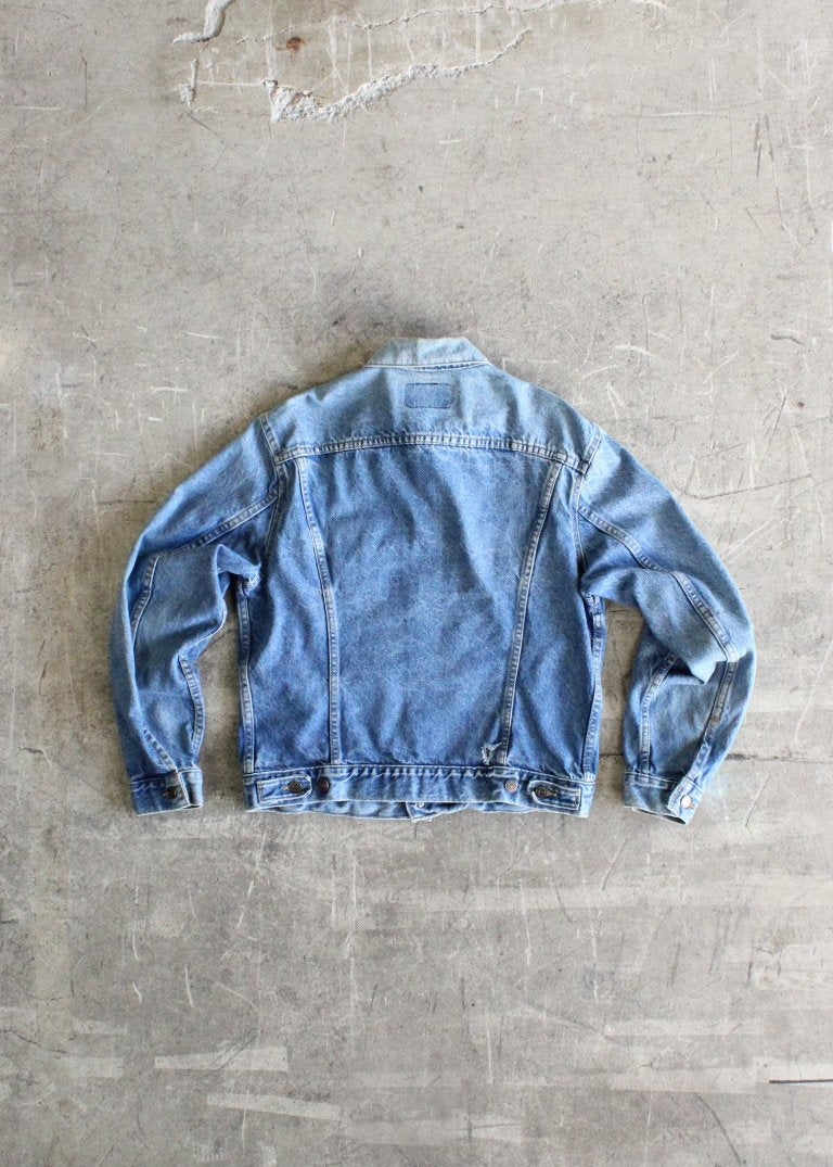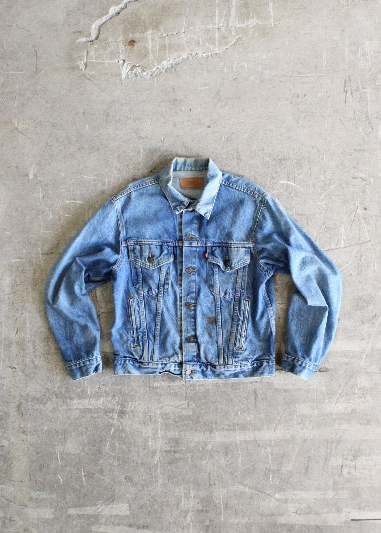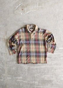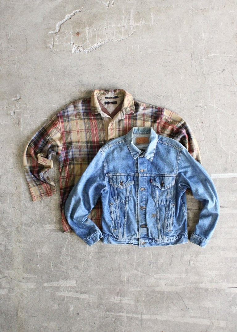 Authentic 1990s Tommy Hilfiger plaid polo style long sleeve paired with an authentic Levis trucker jacket with some slight distress from wear.