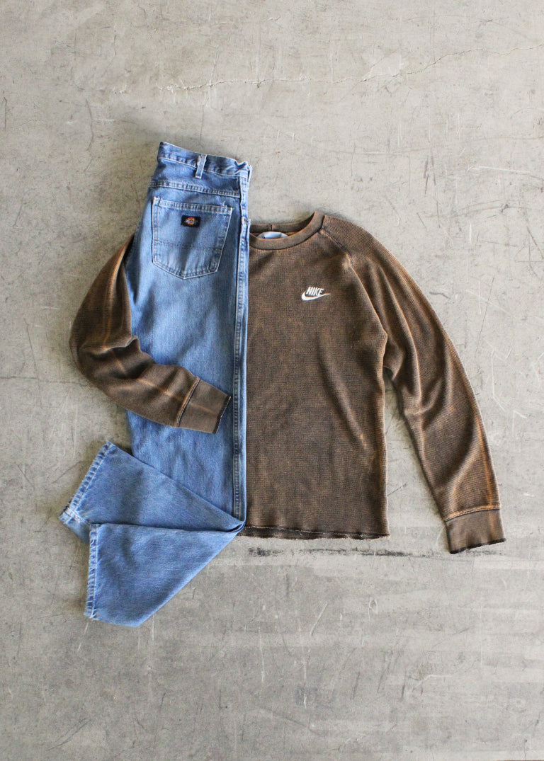 Authentic Y2K over dyed Nike thermal shirt paired with Dickies denim jeans.