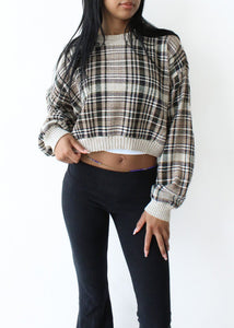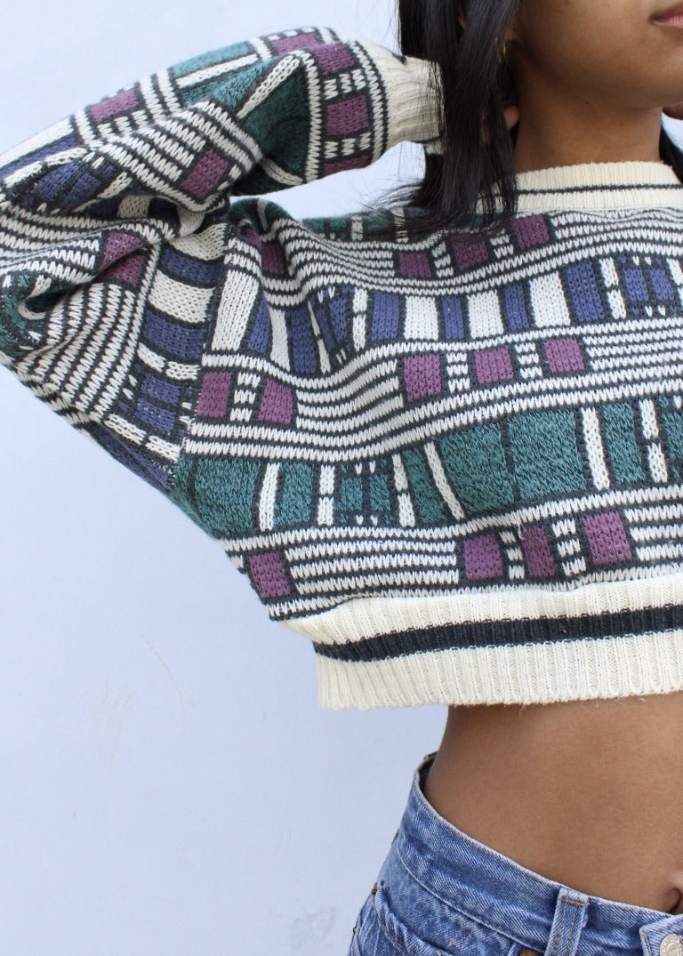 A cropped knit style up-cycled from hand-selected vintage printed sweaters, giving new life to classic designs while maintaining an eco-friendly approach. No two sweaters are alike, each piece boasts a distinct vintage print, ensuring your sweater is as unique as you are.