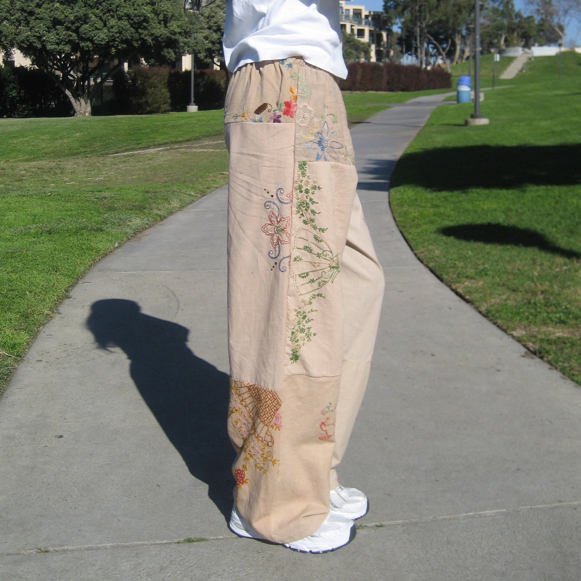 Deconstructed embroidered household textiles reimagined into loungewear elastic waist pant. Handcrafted and sustainably sourced, giving new life to pre-loved textiles, ensuring no two pairs are alike.