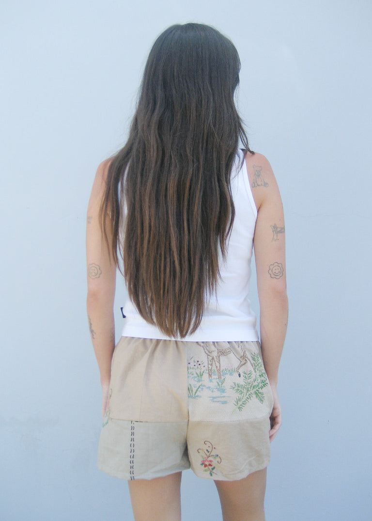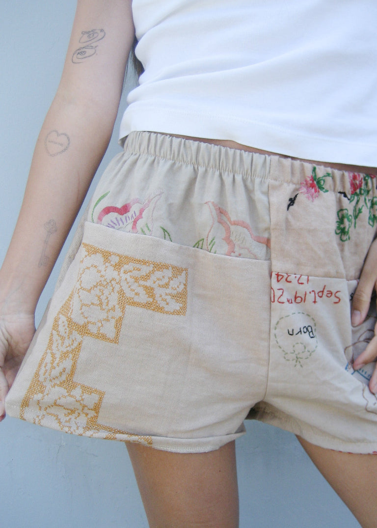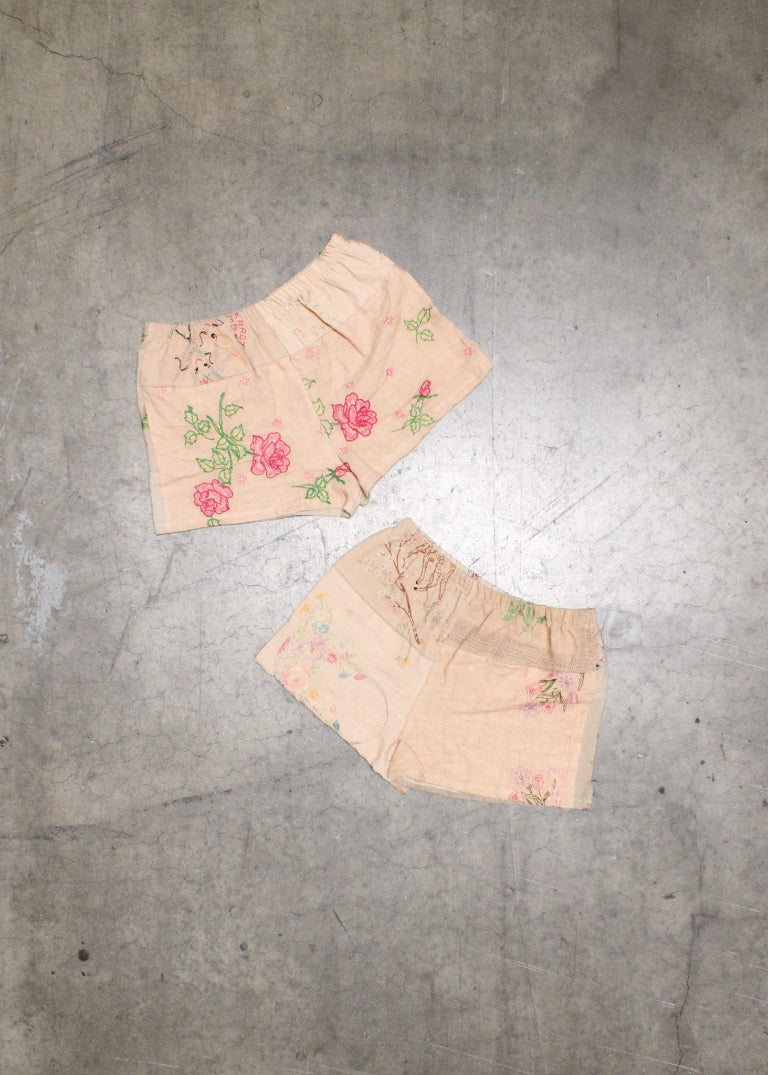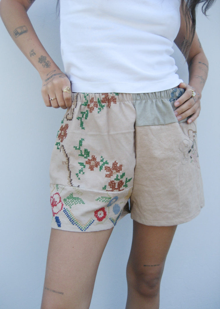 Vintage and recycled deconstructed embroidered blouses and garments reimagined into loungewear elastic waist short. These materials have all been over-dyed with a light brown/ tan color wash to combat stains and imperfections. Handcrafted and sustainably sourced, giving new life to pre-loved textiles, ensuring no two pairs are alike. Your piece will be similar but not identical to the products shown.