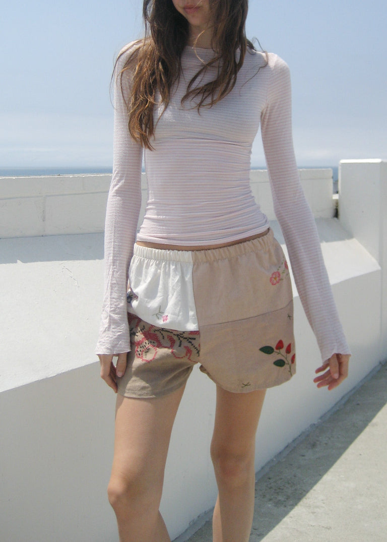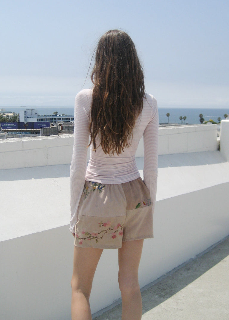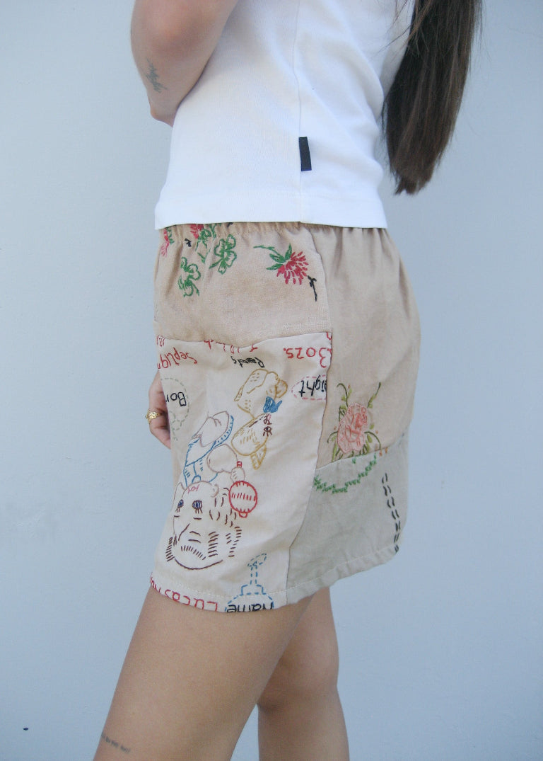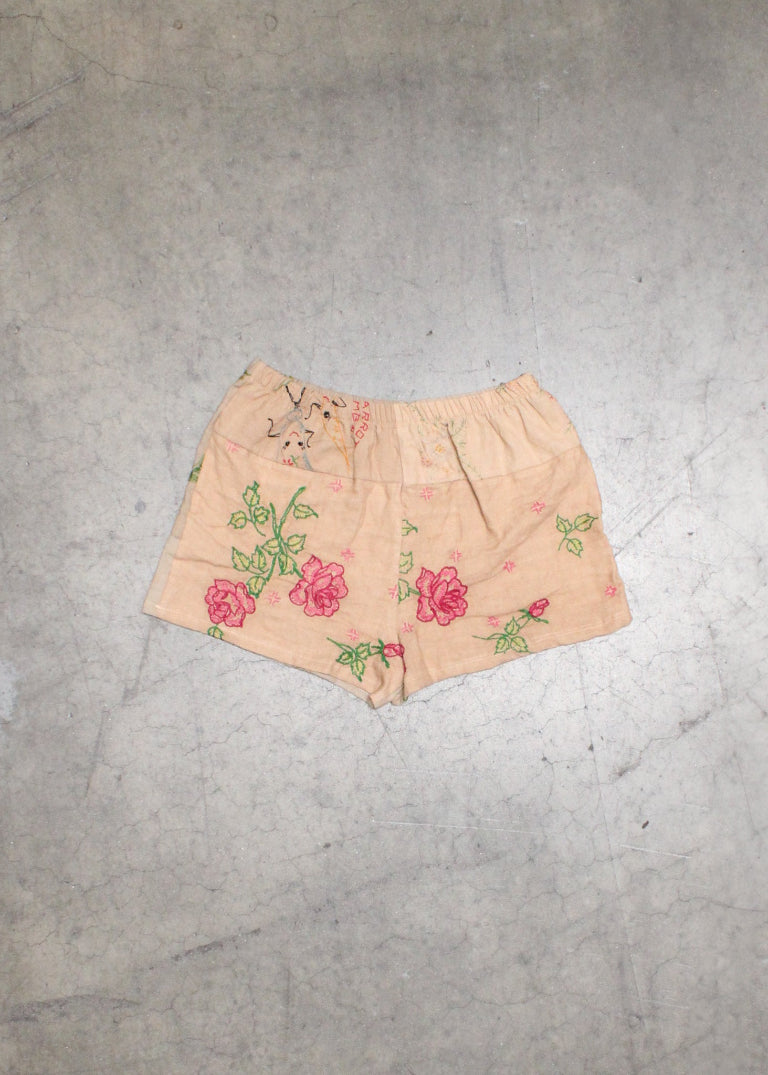Vintage and recycled deconstructed embroidered blouses and garments reimagined into loungewear elastic waist short. These materials have all been over-dyed with a light brown/ tan color wash to combat stains and imperfections. Handcrafted and sustainably sourced, giving new life to pre-loved textiles, ensuring no two pairs are alike. Your piece will be similar but not identical to the products shown.