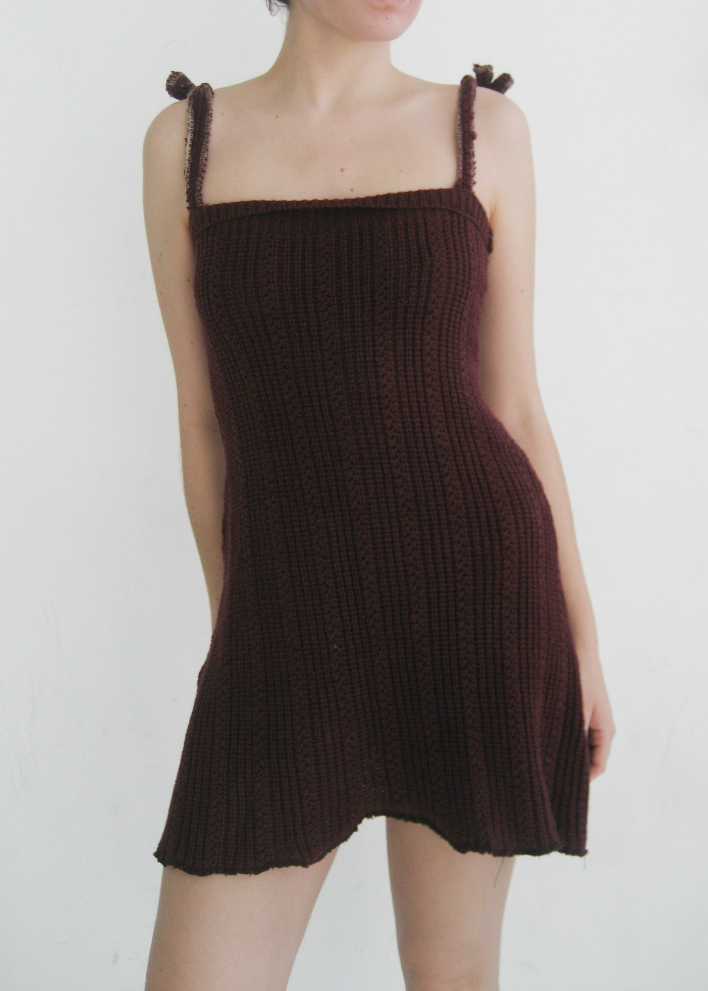 A comfortable and casual dress style made from recycled cotton and acrylic knit sweaters. Featuring a tie strap for versatility and adjustment, each one's unique and your piece will be very similar but not identical to the products displayed.