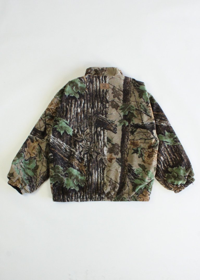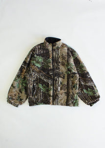 Authentic real tree style nature print reversible fleece and nylon zip up jacket.