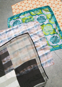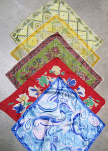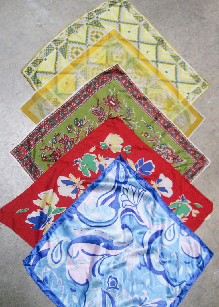An assortment of vintage square scarves. These scarves come in a variety of patterns, colors, and fabric content. Your piece will be similar but not identical to the product shown.